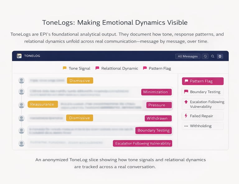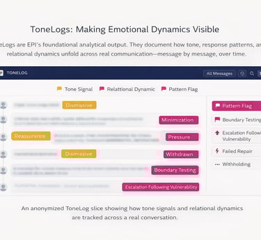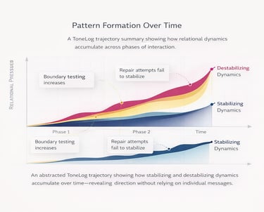 Rather than isolating words or sentiment, ToneLogs surface structure: where pressure accumulates, where repair attempts fail, and where imbalance becomes patterned.