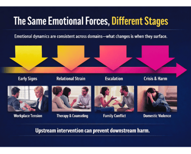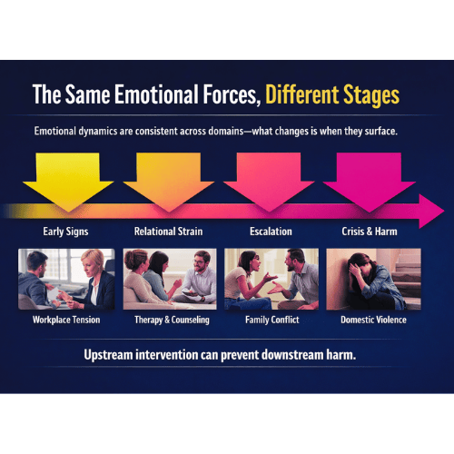 Whether in domestic violence prevention, therapy, workplaces, or platforms, the emotional forces are the same.